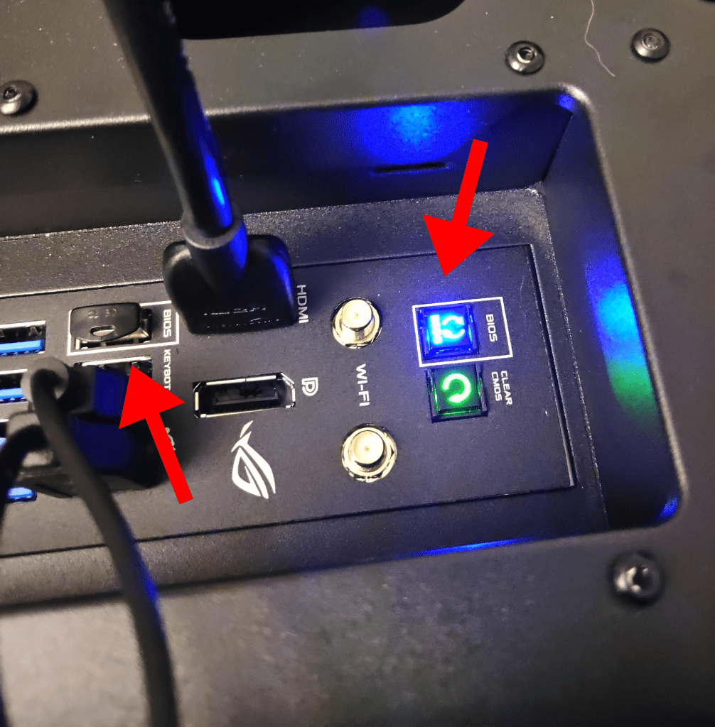 With everything now wired correctly I pressed the power button once more and watched as the fans began to spin, the CPU cooler lit up and the board booted, cycling though its boot codes until it settled on “Check CPU”. Huh, okay? I looked at the motherboard socket: yep, there’s definitely a CPU installed, Check! Unfortunately, the board didn’t like my snarky answer so I reached for my trusty manual! “Check CPU” could be several things, but mostly it refers to an unsupported CPU being loaded into the socket. Well I knew the 9600K was supported but then it hit me, this board was released before the 9th-Gen core processors! I’d need a BIOS update, but without a functional CPU that the MOBO knew how to use, how could I? I glanced around, searching for any free-ranging 1151 chips to no avail. Luckily Asus and a few other manufacturers have thought this through in recent years and built a BIOS flashing USB port on the I/O panel with a handy little button to initiate the flash. I burned the latest BIOS image to a flash drive and began the process!