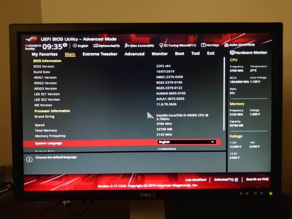 With the BIOS freshly installed I rebooted the PC, happily reaching the BIOS screen! And wouldn’t you know it, the MOBO now recognized the CPU. How about that?