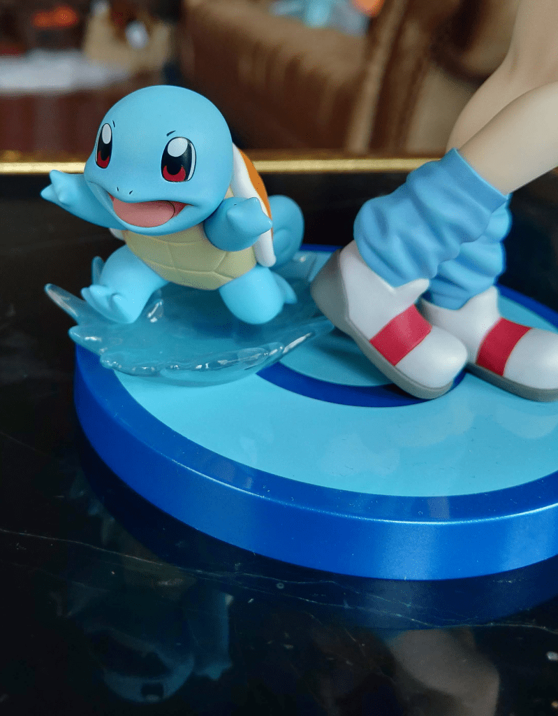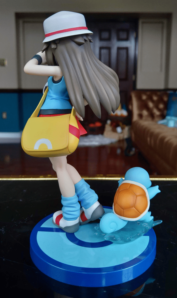 Squirtle is equally well-done with smooth curves and eye-popping color. The “Tiny Turtle” Pokémon is gliding forward on a translucent wave as if using the “Hidden Move” Surf, successfully giving the little figure a sturdy, free-standing base to balance on at the foot of his Trainer. The ability to remove the Pokémon without leaving mounting holes exposed on the base is a nice touch, and Leaf is centered enough that displaying her without her partner wouldn’t look odd or leave something lacking for the figure overall. I will probably display them together, but as I said I appreciate the option.