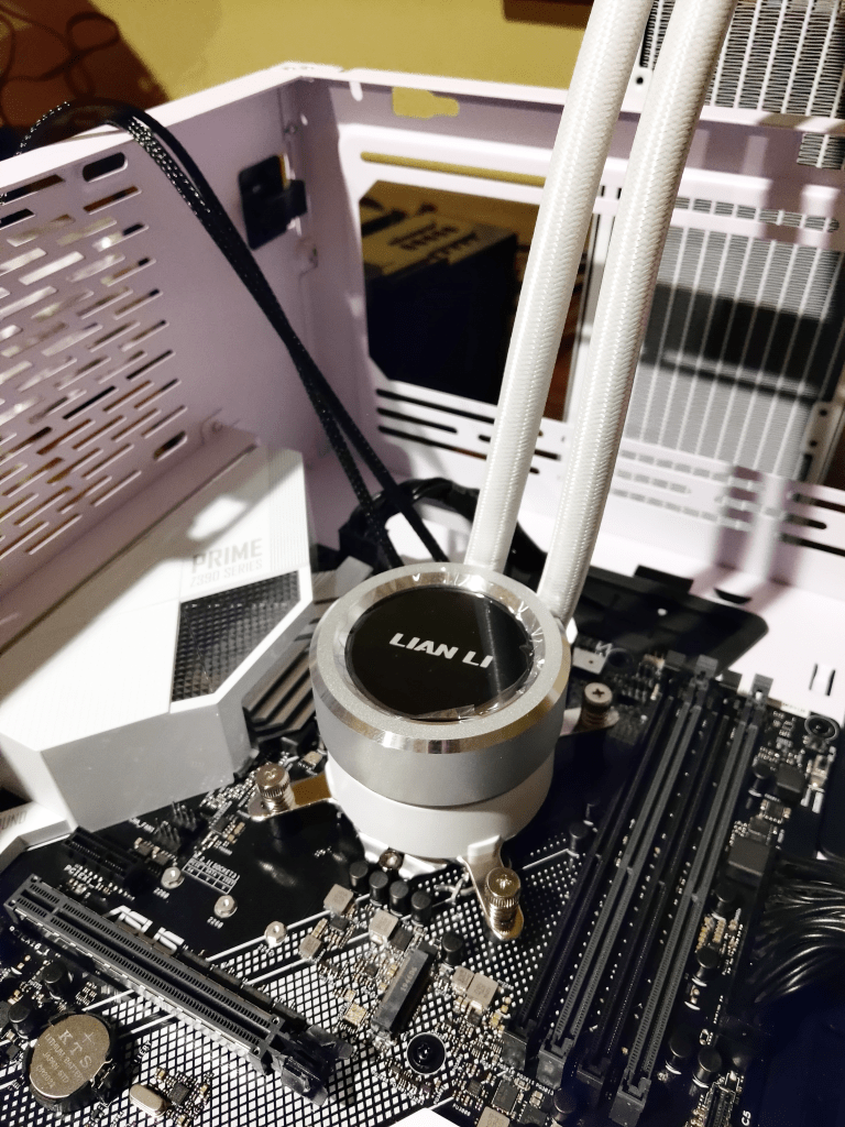 With her modest hardware specs there really wasn’t a need for watercooling other than maybe an AIO for the CPU, but because it “looks really pretty” she wanted a full distribution plate and hard-tubing setup. However, when we were unable to get the 011D and instead went with the XL she wasn’t able to get the distro-plate for it and opted for a Lian Li Galahad 360 supported by extra fans: a three-pack of Lian Li UNI FAN SL120.