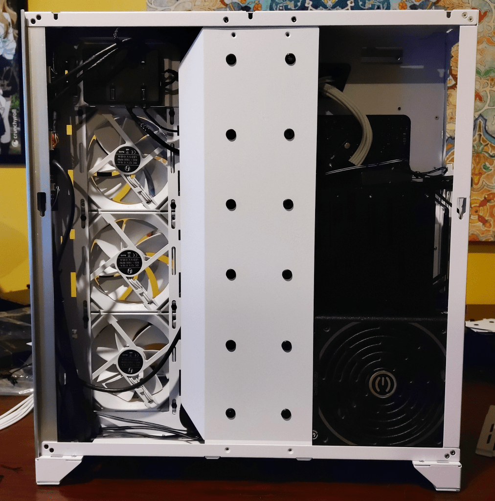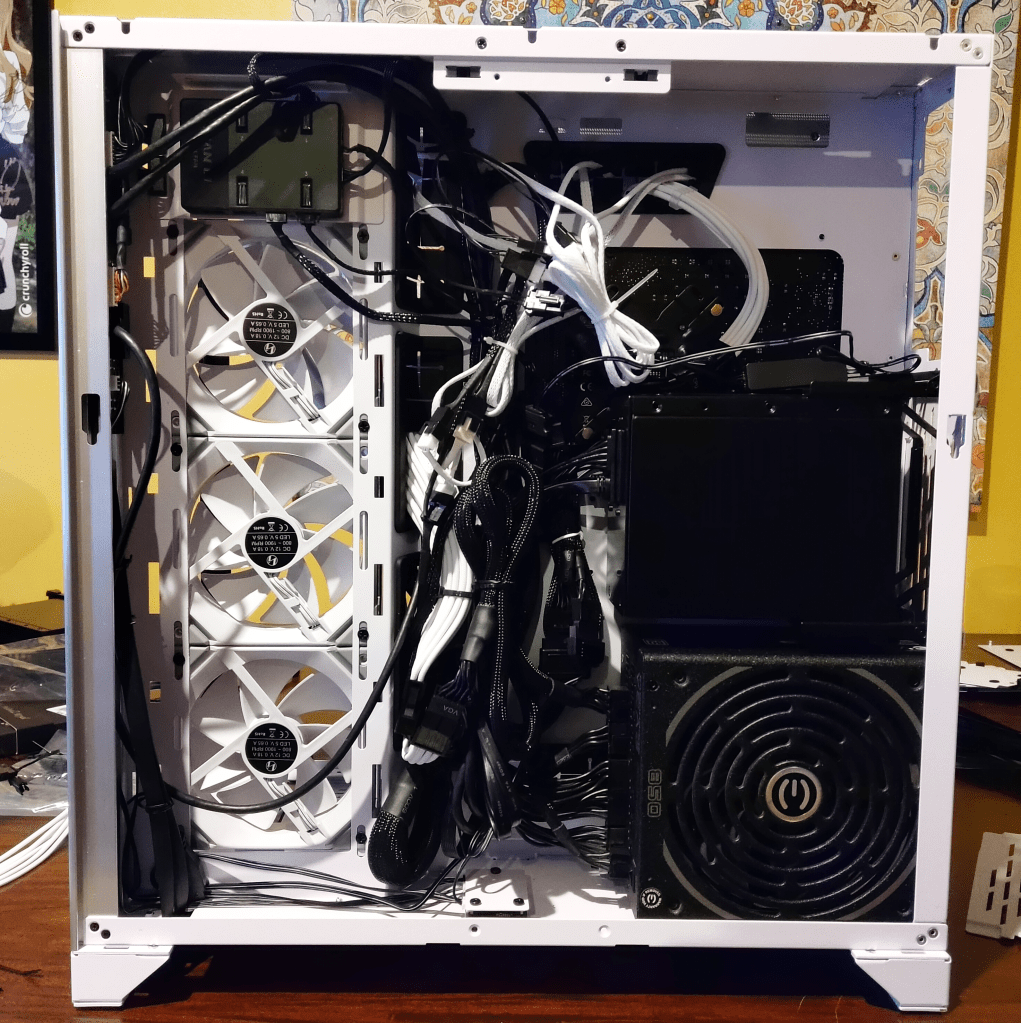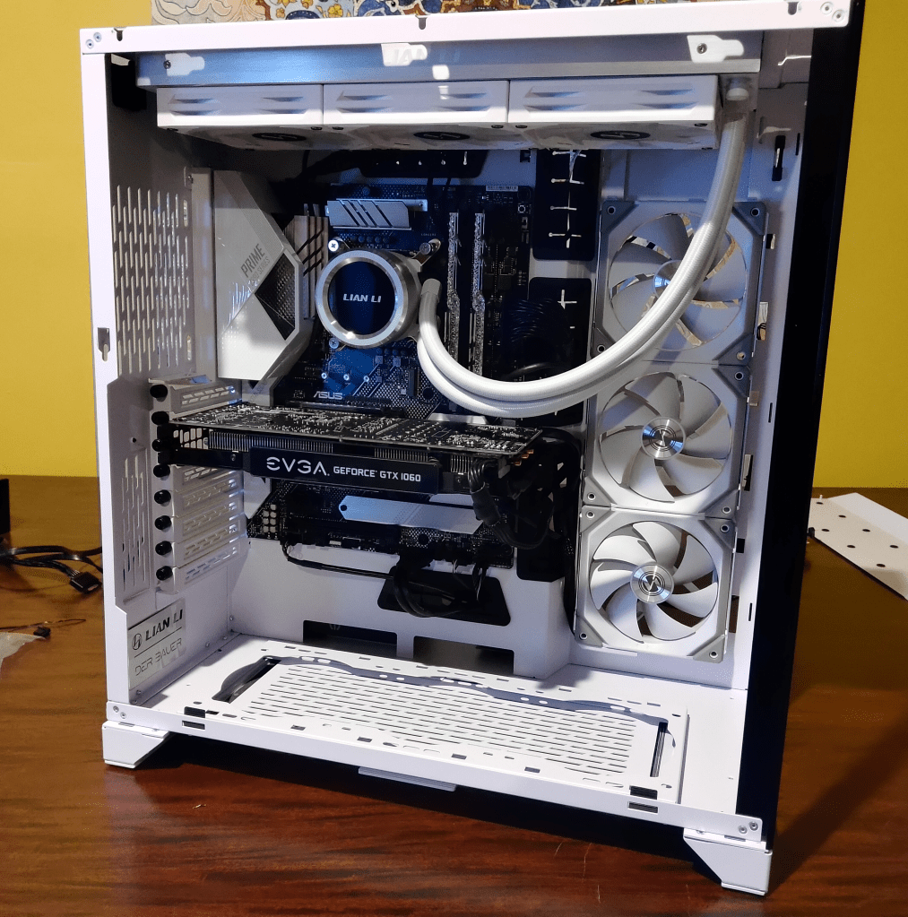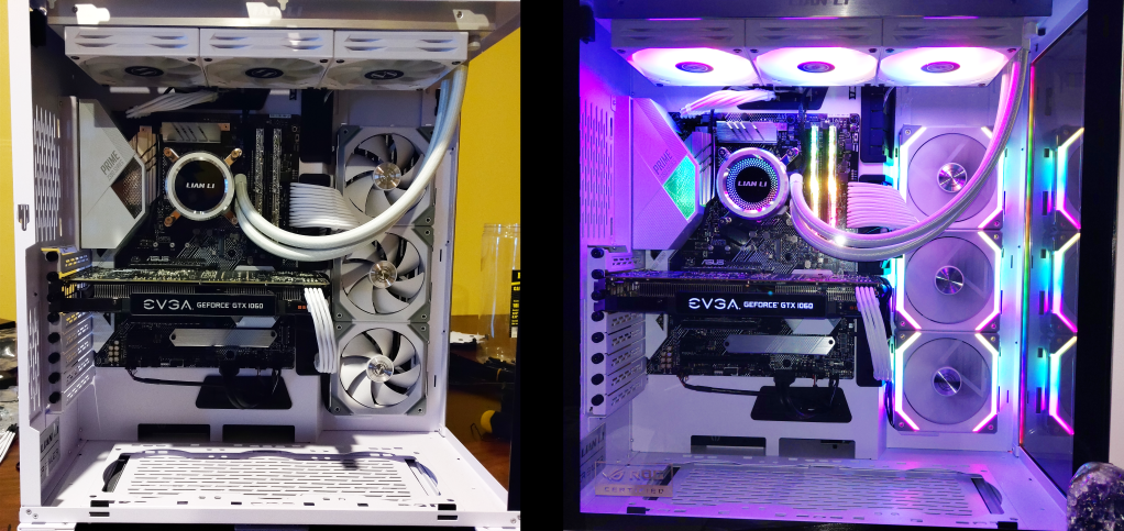 And voila! A beautiful Lian Li ROG XL chassis complete with Lian Li fans and AIO! There are a few bits and bobs I’d like to add to it (right-angle USB 3 connector, a few other adapters) but my wife’s main concern was the color of the cables! The black CPU, ATX, and GPU power cables were very unappealing, so we bought some AsiaHorse sleeved cable extensions in white which changed the feel of the PC immediately.