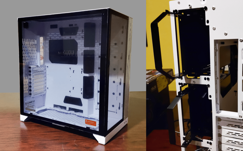 First off, this was my first time building in a Lian Li chassis and I was very impressed! I like large chassis anyway (looking at you, Maria…) so using the XL was a lot of fun, but Lian Li really knocks it out of the park with their designs. The rear-facing drive bays were incredible: 4x SATA bays for either 3.5″ or 2.5″ drives, hidden away in the rear of the chassis but easily accessible if you need to swap anything and removable if you don’t need them! For this build we were only going to use two SATA drives, so removed the upper bay to make way for a little more room for cable management.