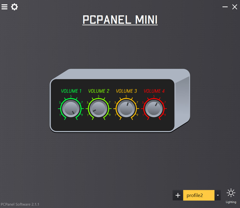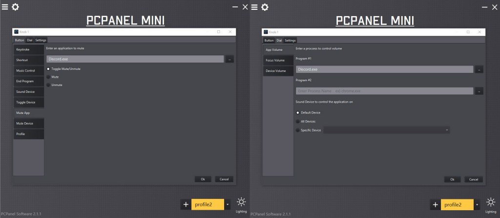 Plugging the device into my PC it lit up right away, the RGB lighting kicking off a very smooth rainbow wave effect despite how few LEDs it could logistically fit horizontally. I pulled down the controller software from the PCPanel website and installed it, suddenly greeted by a large virtual representation of my PCPanel device. Setup was very straightforward: just click on the dial you want to configure and there you go! There are three separate tabs for “Button”, “Dial”, and “Settings”, with settings being the scale the dial uses as you turn it. Program associations are per knob, per button/dial so you can set the dial to control the volume of an app while the button press mutes it, launches it, runs a shortcut, or launches/controls another app altogether! You could also set it to end a program, toggle to a different audio device, or even switch between your saved PCPanel profiles. Yep, you heard me right: you can set and save what appears to be an unlimited number of profiles for your PCPanel, meaning you can extrapolate your four volume knobs even further with a little profile-switching-button magic!