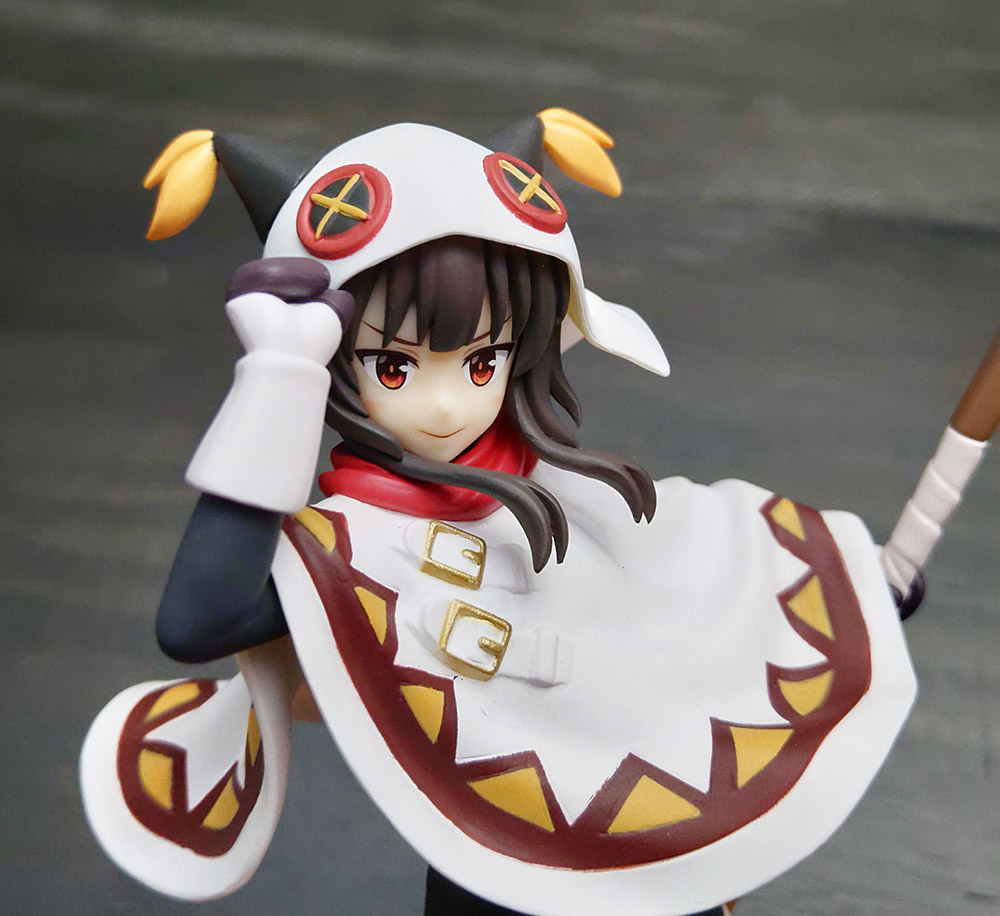 Overall it’s a beautiful figure; Megumin’s powerful pose and flowing poncho and hair really add a dynamism to this figure that stands in stark contrast to a lot of cheaper figures’ static-looking stances. The painting of major parts is solid, but as you get into the finer details (like the buckles and tooth pattern on her poncho, or buttons on her hat) you start to notice some spillover. Unfortunately, the lack of fine detail is par for the course on figures of this tier so while I can call it out for the sake of review it’s not unexpected to see, and when stored in a display cabinet on a non-eye-level shelf it’s hardly noticeable.